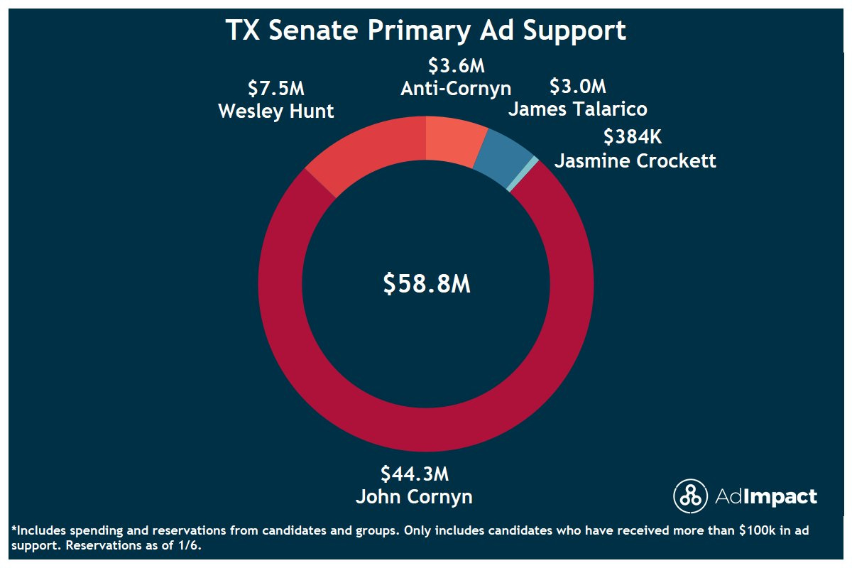 In the Republican primary, incumbent Sen. John Cornyn faces state Attorney General Ken Paxton and Rep. Wesley Hunt, along with five other minor candidates. The contest has largely been defined by the campaign spending of Cornyn and his allies. In early January, an analysis from AdImpact found that ads supporting Cornyn made up 75% of all ad spending in the Texas race â more than $44 million in total. Early spending by pro-Cornyn forces did appear to successfully ding Paxton last summer, when Paxtonâs lead shrank in head-to-head polling against Cornyn. But Huntâs entry into the race in October further scrambled this contest.