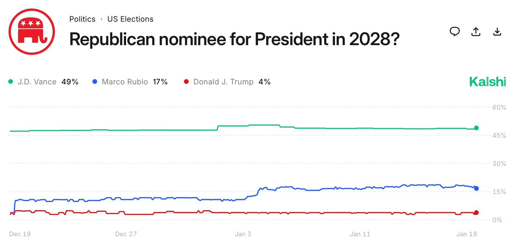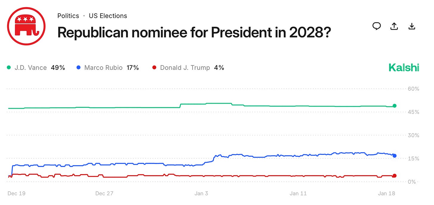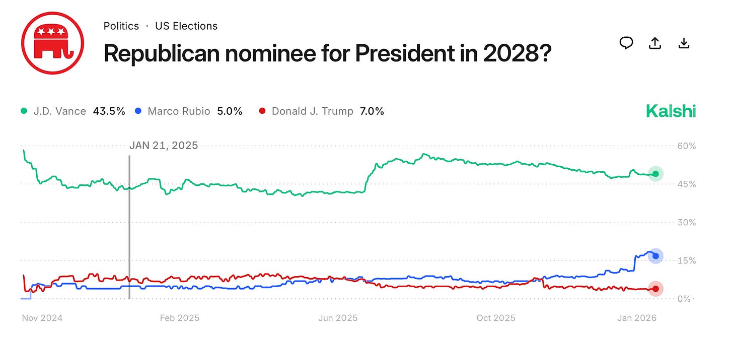 As President Trump was being sworn into office last January, markets already were pricing in Vice President JD Vance as the clear leader to carry the MAGA mantle into 2028. Look at where Iâve put my cursor on the left hand side and youâll see that Vance was running a roughly 44% chance of being the Republican nominee next go-around: